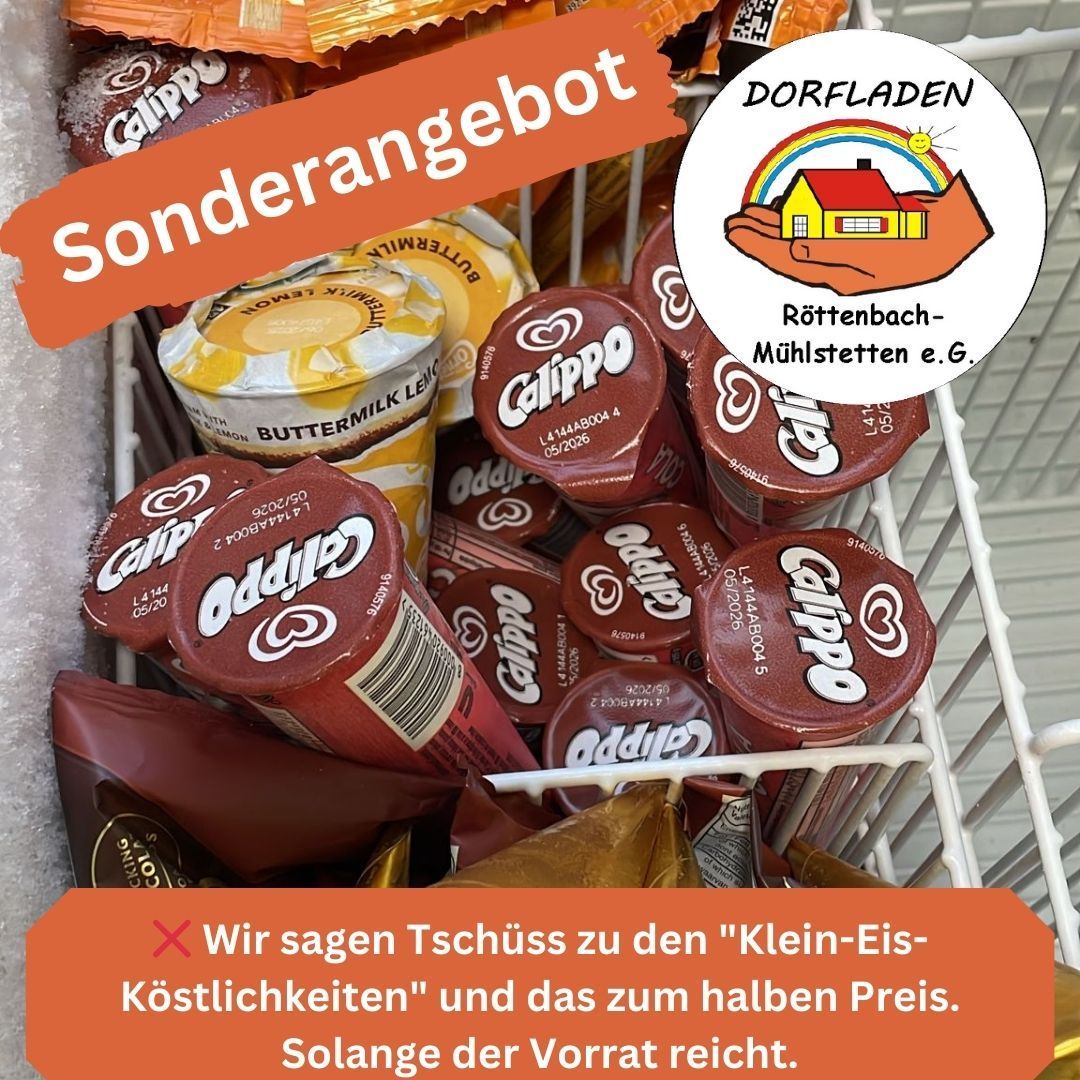 - Von unserem "Klein-Eis" in unserer kleinen Tiefkühltruhe, die wir zügig in den Winterschlaf schicken möchten, wollen wir uns verabschieden. Alle vorhanden "Klein-Eis-Produkte" in dieser Truhe werden zum halben Preis verkauft. Auch hier gilt, so lange der Vorrat reicht.